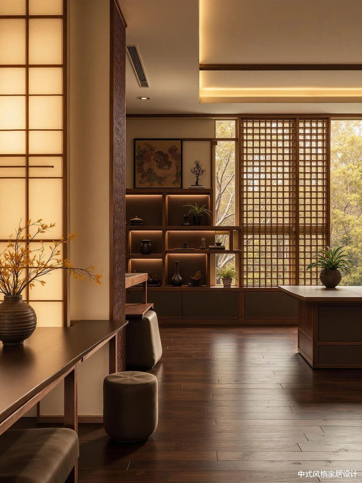 新中式禅意茶室,整体以温润木色为基调,融合东方美学与现代设计。半透光格栅屏风,暖光透过木格投下斑驳光影;嵌入式博古架,层板错落摆放青瓷茶具、陶罐与干花摆件,暖黄灯带勾勒轮廓;木质格栅窗与落地窗相连,窗外绿意引入室内,窗边陶罐绿植增添生机;深色实木地板,搭配简约茶桌与蒲团,线条利落。空间以留白凸显禅意,木质肌理、光影层次与自然元素交织,营造宁静雅致的东方韵味。