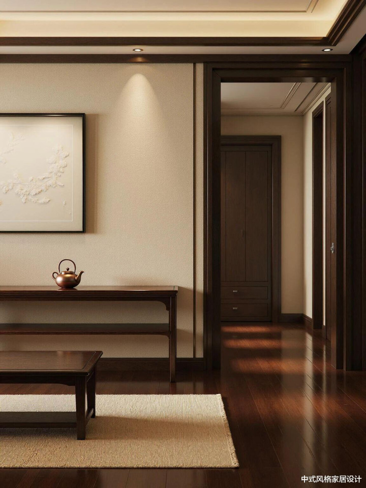 深色木质地板搭配米色地毯,奠定沉稳基调;深色木质长桌上置铜茶壶,旁配低矮茶几,线条简洁利落。墙面悬挂水墨意境装饰画,与深色木门、简约吊顶相映,光影柔和,尽显传统韵味与现代设计的融合。