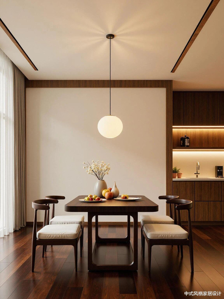 宋韵新中式风格餐厅,整体以木质元素为主调,搭配白色墙面与深色木质地板,营造温润雅致氛围。中央摆放深色实木餐桌,搭配布艺软垫餐椅,桌上点缀白瓷花瓶插白花与水果盘,尽显生活气息。餐桌上方悬挂圆形磨砂玻璃吊灯,光线柔和洒落。一侧木质橱柜嵌入暖光灯带,与浅灰色窗帘形成层次,自然光与室内灯光交织,凸显东方雅韵。