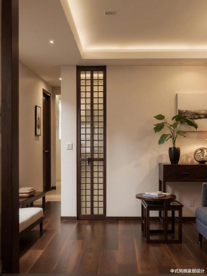 宋韵新中式风格的室内空间,以白色墙面为底,搭配胡桃木色家具,整体沉稳雅致。中央设木质栅格门作软隔断,通透划分区域;左侧长凳与换鞋凳连为一体,动线流畅。右侧矮几上置青瓷花瓶与素雅摆件,线条简练;地面为深色实木地板,光影透过栅格门洒落,营造温润静谧氛围。