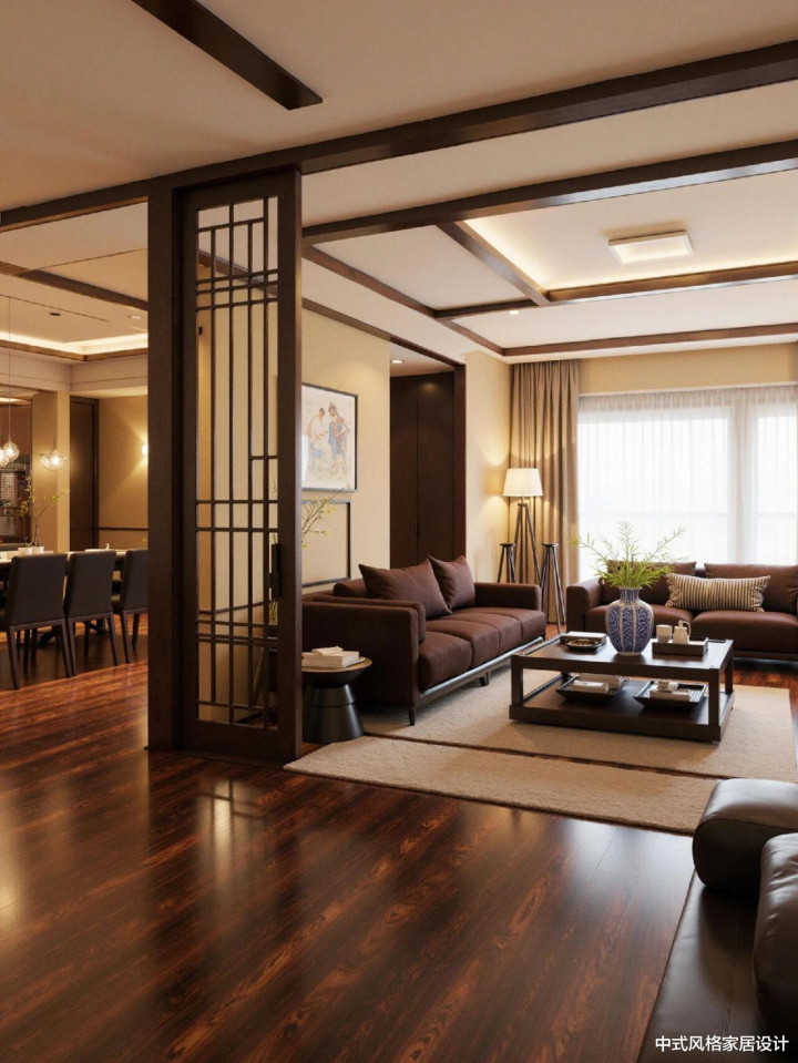 客厅,整体以深棕色实木地板为基底,搭配米色布艺沙发与深色皮质单椅,形成沉稳雅致的色调。中央摆放黑色实木茶几,上置青花瓷瓶与茶具;沙发旁立柱式台灯散发柔和暖光,与窗外自然光交织。背景墙悬挂水墨人物画,木质格栅屏风半隔餐厅区域,保留通透感的同时划分功能分区。通过传统元素(格栅、水墨画)与现代材质(布艺、皮质)的融合,营造出兼具文化底蕴与当代舒适的静谧氛围。