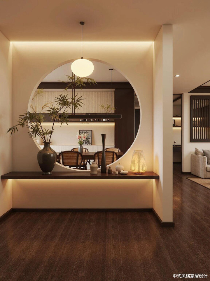 玄关,以浅色系为基调,搭配胡桃木色悬浮桌板与地面,层次分明。墙面嵌入圆形镂空隔断,内侧可见餐厅木质餐桌与吊灯,形成通透视觉联动。玄关台面摆放竹编台灯、陶制花瓶(插有修长绿植)及小巧摆件,暖光从顶部与隔断边缘漫出,营造温润雅致氛围。整体设计融合传统意境与现代简约,兼具实用性与美学感。