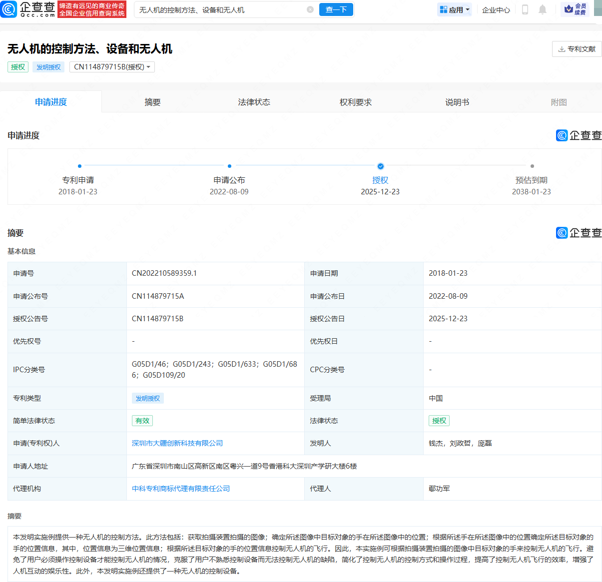 近日,深圳市大疆创新科技有限公司申请的“无人机的控制方法、设备和无人机”专利获授权。专利摘要显示,本发明实施例提供一种无人机的控制方法。此方法包括:获取拍摄装置拍摄的图像;确定所述图像中目标对象的手在所述图像中的位置;根据所述手在所述图像中的位置确定所述目标对象的手的位置信息,其中,位置信息为三维位置信息;根据所述目标对象的手的位置信息控制无人机的飞行。因此,本实施例可根据拍摄装置拍摄的图像中目标对象的手来控制无人机的飞行。避免了用户必须操作控制设备才能控制无人机的情况,克服了用户不熟悉控制设备而无法控制无人机的缺陷,简化了控制无人机的控制方式和操作过程,提高了控制无人机飞行的效率,增强了人机互动的娱乐性。此外,本发明实施例还提供了一种无人机的控制设备。