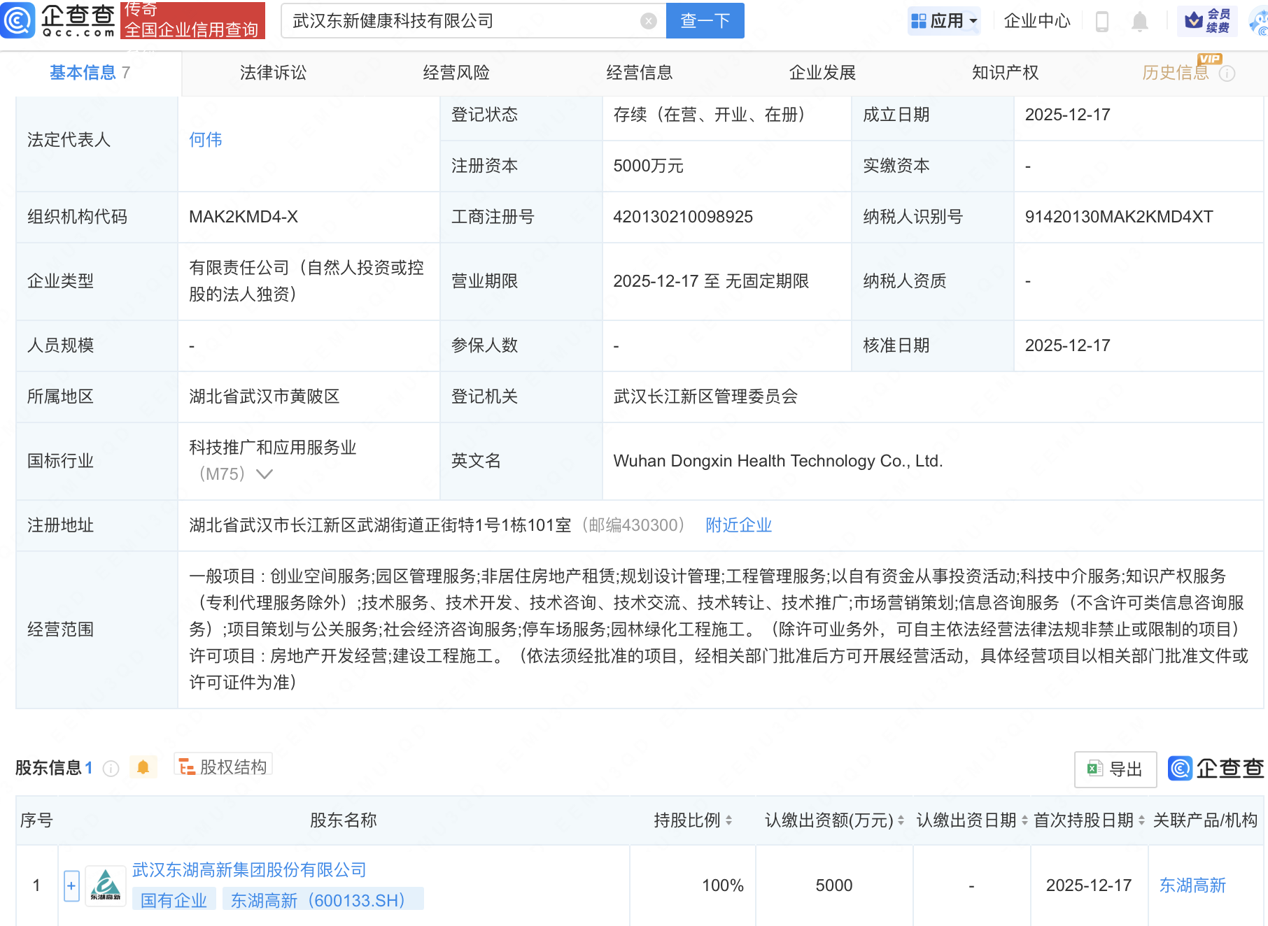 近日,武汉东新健康科技有限公司成立,经营范围包含:创业空间服务;园区管理服务;非居住房地产租赁;规划设计管理等。企查查股权穿透显示,该公司由东湖高新(600133)全资持股。